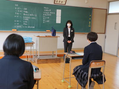 今日は午前中の4限授業とし、5限目に全校集会を開いて休校中の生活についての連絡と注意を行いました。寒い中でしたが扉は開け放ち、生徒間の距離も広めに取りました。