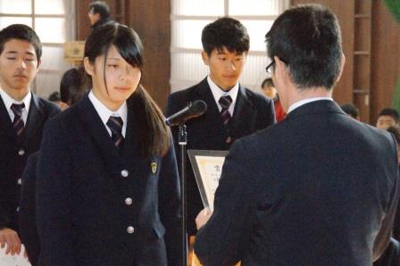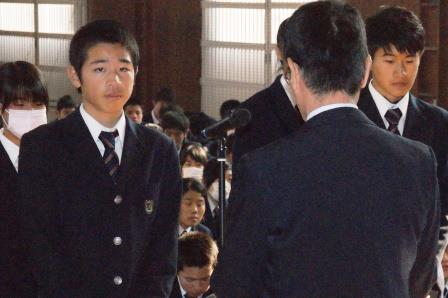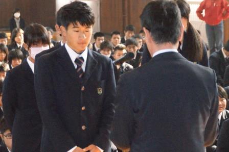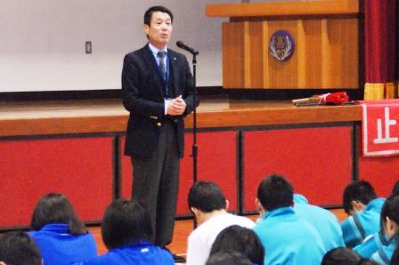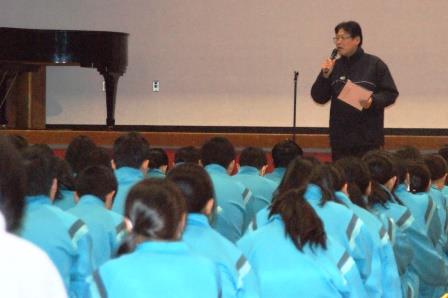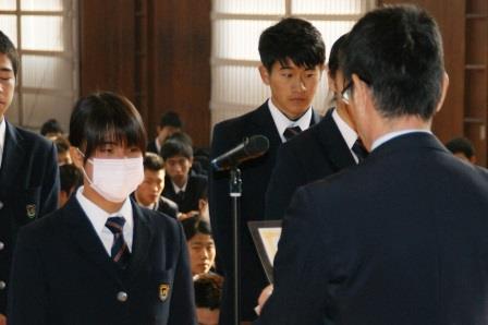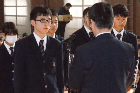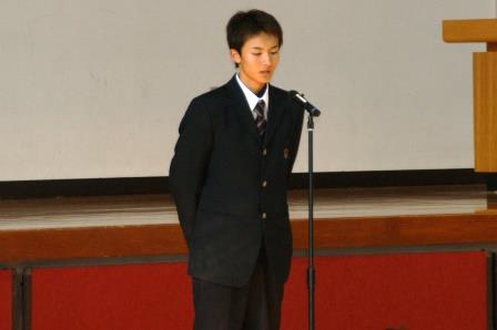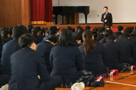 | 黙想で心を静め 終業式の始まりです。 校長講話 「3年生は社会人になります。2年生は進路決定が間近になってきました。1年生は学校の中心である2年生になります。冬休みの間に意識を高め、準備を進めておいてください」 「周囲の期待は大きい。自信を持って学んでください」 校歌斉唱 よく声が出ていました。 各部からの連絡 教務部:進級・卒業に向けて努力を 保健部:冬休み中、健康に注意して 生徒支援部:チャイルドラインなども利用して、 悩みを抱え込まないように 農場長:冬休みの当番を忘れないように 生徒部:校外でも整容を整えよう SNSに関するトラブルに注意して 交通事故が多発しています ・被害者にならないこと! ・加害者にならないこと! ・死なないこと! 以上で終業式が終了。 1年生・2年生は引き続き学年集会を行い、その後LHR。 1年生 2年生 3年生はそのまま教室にもどり、LHRを行いました。 明日からは冬休みです。心身のリフレッシュを図ると同時に、日頃できない家の手伝いや将来に向けての話し合いなども行ってください。 ※3学期は1月10日(火)から始まります。忘れないように! |