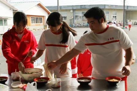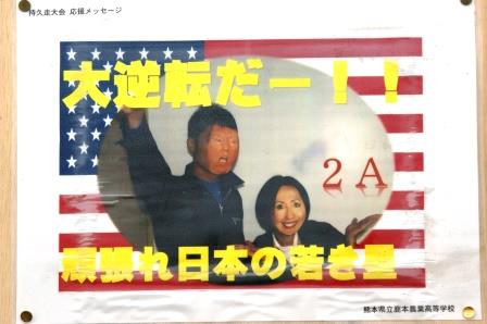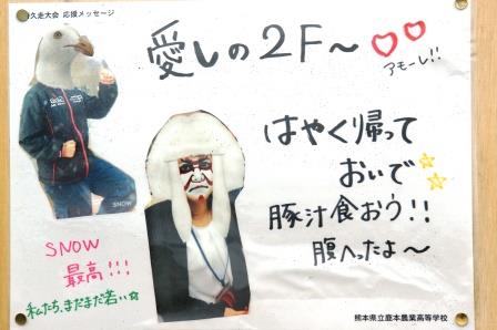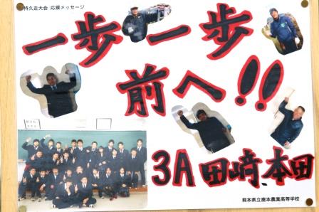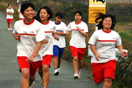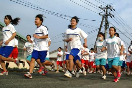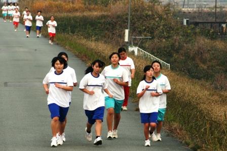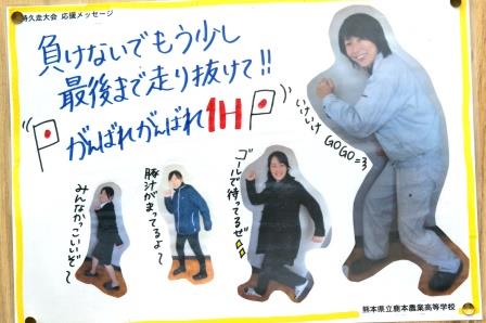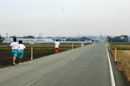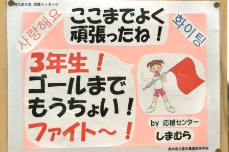 | 今日は持久走大会を行いました。 男子は10km(制限時間90分)、女子は6km(制限時間は60分)です。 <開会式> 開会の言葉 校長あいさつ 競技上の注意 選手宣誓 閉会の言葉 このあと、各自で準備体操、ウォーミングアップをしてスタートを待ちます。 <競技の様子> 男子スタート 女子スタート 今日はお隣の鹿本商工高校も持久走大会。途中すれ違うシーンもありました。 終盤には長い長い直線があります。 くじけそうになる生徒たちを励ますべく、先生たちからの応援メッセージが並びます。 なんと、アメリカのあの方たちからもメッセージが! ...ん? 生徒の安全を守るべく、先生たちは自転車や車で巡回します。中には一緒に走る先生も。 <ゴールの後のお楽しみ> ゴールの後は、保護者の皆様から豚汁の振る舞いがあります。 <閉会式> 開会 の言葉 表彰式 優勝 記録 33分39秒 35分15秒 2位 記録 37分12秒 35分15秒 3位 記録 38分53秒 36分38秒 講評 閉会の言葉 途中棄権は一人もなく、完走率100%でした。 すばらしい!! 残念ながらタイムオーバーだった生徒もいますが、それでもあきらめることなく、最後まで頑張る姿はすてきでした。 みなさん、お疲れ様でした。 |