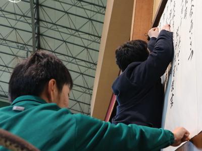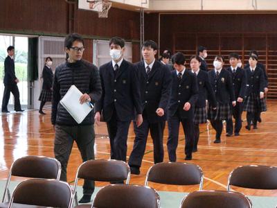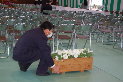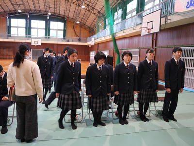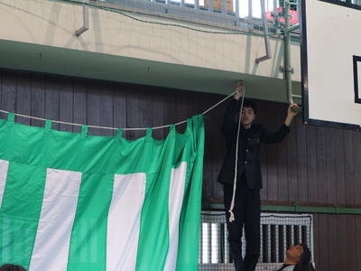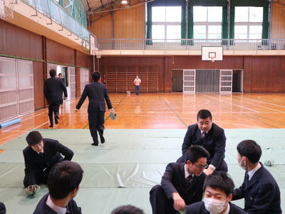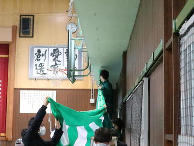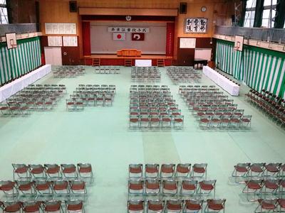 今日の午後は、卒業式の会場設営でした。 設営の担当はバスケット部・サッカー部・バドミントン部・郷土芸能伝承部・三部会(生徒会・農業クラブ・家庭クラブ)役員です。 まず体育館フロアにシートを敷きます。 イスを運び出したら まずはざっと並べ そあと、距離を測りながら整えます。 並べたイスは丁寧に拭いてくれました。 周囲には緑白の幕を張り 正面には式次第などを掲示して 完成です! 日頃から実習で鍛えられているためか、一人一人がてきぱきと動いてくれ、予定よりも早く設営が終わりました。 また、設営担当以外の生徒も、大掃除を頑張ってくれました。 みんな、ありがとう。 |