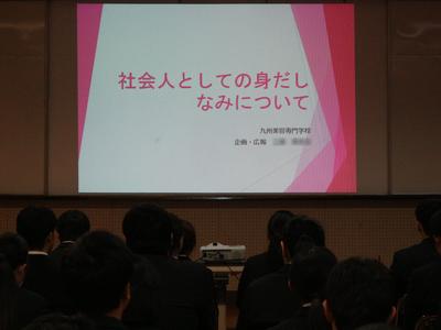 3年生は4月から社会人となり、求められる身だしなみが今までとは大きく変わります。 生徒たちが戸惑わないように、「社会人としての身だしなみ講座」を行いました。 講師として、九州美容専門学校から4名の先生に来ていただきました。 さすがは美容の専門家。皆さんきちんとした身だしなみで、生徒のテンションが一気に上がります! まずは全体会です。社会人として押さえるべき身だしなみのポイントについて教えていただきました。 身だしなみの三原則は「清潔感」「機能性」「調和」です。 また、TPOに合わせて服装などを変えることも大切です。