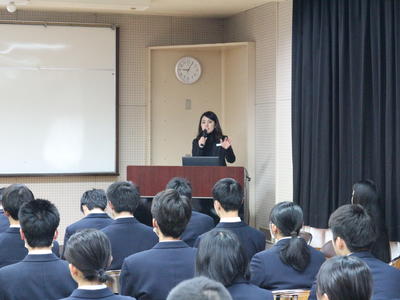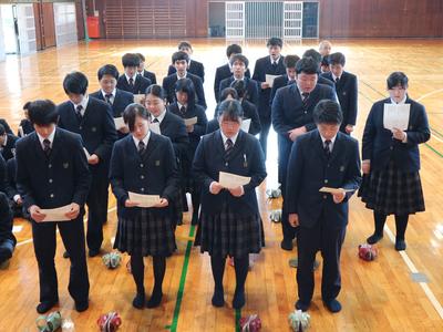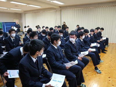3年生は家庭学習期間に入って2回目の登校日でした。 1限目:学年集会 <進路指導主事講話> 就職・進学を間近に控えた今、気をつけなければいけないことは何か。最近問題になっているSNSへのおふざけ投稿なども例に挙げながら、話がありました。 研修先で撮った写真を軽い気持ちでSNSに投稿したら、そこに部外秘の情報が写っていた、なんてことも起こりえます。そうなると内定取り消しはもちろん、莫大な補償を請求されることも。絶対にやめましょう。 <進路模試成績上位者表彰> 2年生から行ってきた進路模試の、成績上位3名が表彰されました。豪華な(?)副賞付きです。 よく頑張りました! <消費者教育> 社会に出たばかりの若者がお金のトラブルに巻き込まれるケースが、とても増えています。昨年度、なんと39,000人!そのようなトラブルに生徒たちが巻き込まれないように、契約やキャッシング、ローンなどについて学習をしました。 講師は地歴公民の先生です。自身の実体験も交えた話は、リアリティ満点です。 DVDやプリントを使いながら、気をつけるべきポイントを押さえていきます。 みんなの押印やサインは、これから先重要な意味を持つようになってきます。十分に注意してください。 2限目:式歌練習・整容指導 <式歌練習> 卒業式では「君が代」「仰げば尊し」「鹿本農業高校校歌」の3曲を歌います。大きな声で歌えるよう、練習しました。 伴奏は施設園芸科の担任の先生です。すごい! まずみんなで一緒に歌ったのですが、 声が小さいので、クラスごとに歌うことに。 施設園芸科 食品工業科 バイオ工学科&生活科学科 声が小さいとやり直しです。何度も繰り返すうちに、徐々に大きな声が出るようになってきました。 最後にもう一度全員で歌います。 最初とは比べものにならないくらい、大きな声が出るようになりました。すばらしい! <整容指導> 男女に分かれて、卒業式に出席するときの身だしなみを確認します。 中には、ちょっと髪が伸びすぎの生徒も見受けられました。 卒業式まであと1週間ほどです。早めに整えておいてくださいね。 次の登校日は2月27日(水)です。入退場や卒業証書の受領など卒業式の練習をしますので、欠席することがないよう体調を整えておいてくださいね。 |