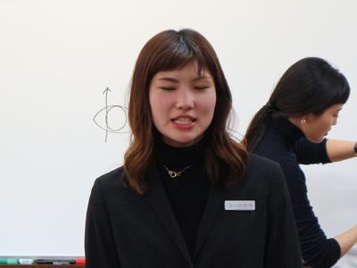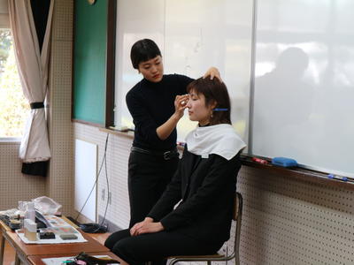 続いては男女に分かれての実践講座です。 <女子> 髪の色はどれぐらいまでOK?色見本を髪に当てながら考えます。 業種によっても違いますが、明るすぎる色はNG。落ち着いた色にしましょう。 社会人としてはメイクも身だしなみの一つとなります。では、どんなメイクが好ましいのか?実演してくださいました。 生徒は興味津々 先生も真剣です。 モデルの先生のメイクを半分だけ直してくださいました。 顔の右半分と左半分とで印象が大きく違うの、分かりますか? 正しいスキンケアの方法も教えてくださいました。今度は生徒がモデルです。 アイシャドウかな?「自分の肌に合う色を探してみてね」 <男子> 香水を付けるならどっち?2種類を嗅ぎ比べます。 匂いがきついものは避けましょう。爽やかな匂いが、上司にも女性にも人気だそうです。 髪の色についても考えてみました。 髪型は「黒髪ショート」が大原則。そして、清涼感のあるセットも大切。セットのコツを教えていただきました。 ドライヤーとヘアアイロンを使って整え ヘアワックスでキープ。ヘアワックスの使い方にもコツがあります。 みてください。この真剣な眼差し。 ウィッグを使って実際にやってみます。