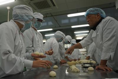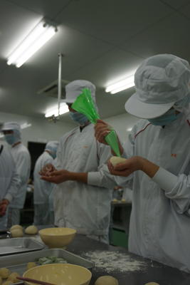 2月14日(木)、2年生がコメロンパン実習に取り組みました。 コメロンパンは米粉とメロン果汁を使ったメロンパンです。2008年に本校の食品加工部が開発し、日本学校農業クラブ連盟全国大会 食料の部において、2年連続で最優秀賞と農林水産大臣賞をダブル受賞した自慢のパンです。 講師は開発当時からご指導いただいている、西原村の古木家様にお願いしました。 今回は時間の都合もあり、パン生地とクッキー生地、中に入れるメロン白玉とメロンクリームは古木家様と先生が事前に準備。生徒はパン生地を丸める所から取り組みました。 中に入れるメロンクリームをちょっとだけ味見。 生地の中にメロン白玉とメロンクリームを入れて成形します。 成形が終わったら、焙炉(ホイロ)で休ませ発酵させます。 発酵前 発酵後 大きく膨らんでいるのが分かりますか? 生徒も興味津々です。 さあ、いよいよオーブンに入れて焼きます。 焼き上がると、実習室内にいい香りが広がります。 さあ、お待ちかねの試食です。本当にメロンが入ったメロンパンはあまりありません。どんな味でしょうか。