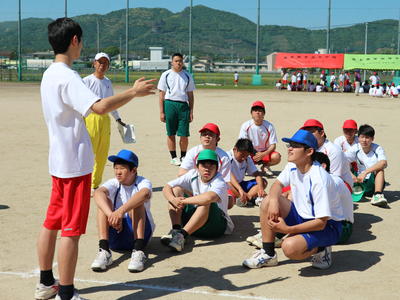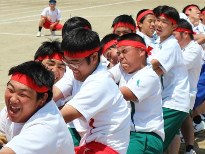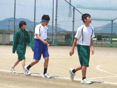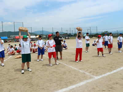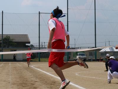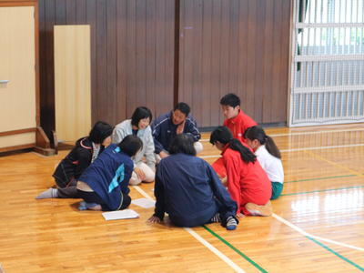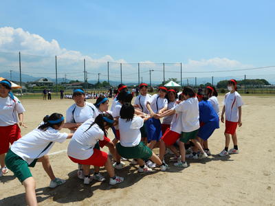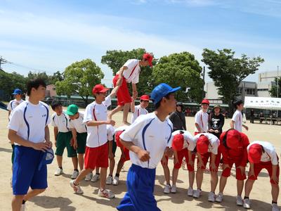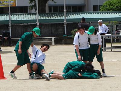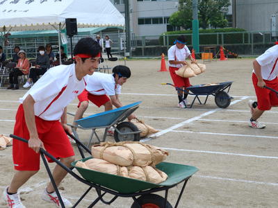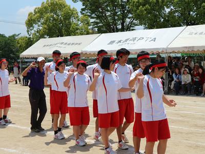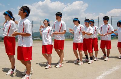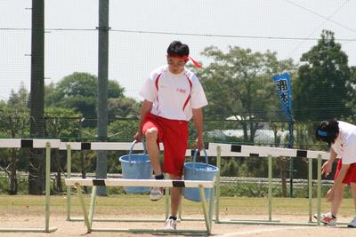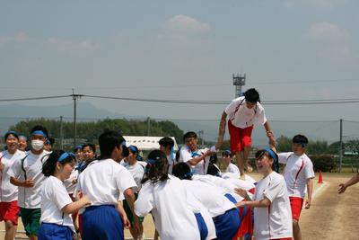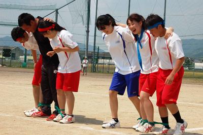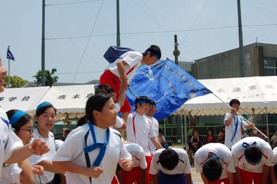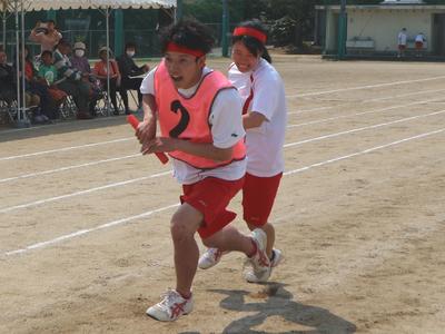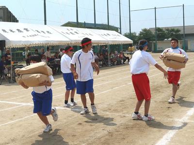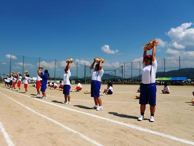 接戦でしたが、青団が先にゴールして学年主任に農作物をプレゼント。青団が勝利しました。 プログラムNo.15 技巧走 まず男女それぞれが、3つの課題に臨みます。 女子 網くぐり ぐるぐるバット 風船を膨らませて、おしりで割ります。 男子 俵運び 一輪車の操作は、以外と難しいです。 ハードル飛び&くぐり クッキーを食べる 口の中の水分が持って行かれるため、想像以上に結構大変です。 それぞれが課題をクリアしたら、同じ団の男女でペアをつくり、共同課題に移ります。 人探し くじで指定された特徴を持つ人を探します。 見つかったら、3人4脚でゴールを目指します。 (つづく) |