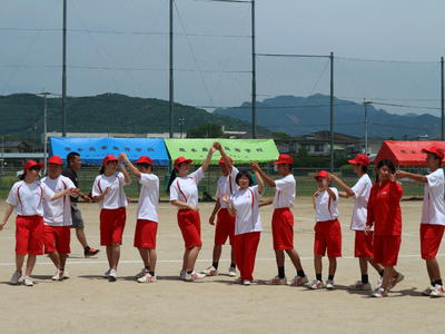 プログラムNo.12 フォークダンス 昨年までは3年生だけの特権でしたが(笑)、今年から全校生徒・職員で、団ごとに踊ることにしました。 これで午前の競技が終了です。 休憩を取り、昼ご飯で栄養を補給して、午後の競技に備えます。