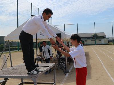 プログラムNo.18 閉会式 成績発表 生徒会役員 「優勝は...青団です!」 表彰 優勝した青団の団長に表彰状が 副団長に優勝旗が授与されました。 また、各科の学科行進に対して表彰状が贈られました。 施設園芸科 食品工業科 バイオ工学科 生活科学科 講評 優勝団長エール 「青春の汗を流したか~!」 「お~!!」 校歌斉唱 万歳三唱 PTA会長様 国旗・県旗・校旗降納 閉会宣言 生徒会副会長 これで今年度の体育大会は終了です。開催時期の変更、団編成の見直し、練習時間の短さなど、不安を抱えての開催だったのですが、生徒たちの頑張る姿、はじける笑顔がたくさん見られた、とても良い体育大会になりました。 鹿農日記での体育大会レポートも、これが最終回です。長い間お付き合いいただいてありがとうございました。 |