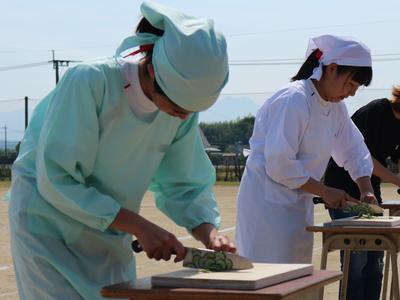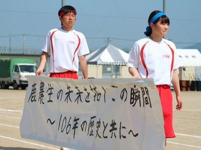 プログラムNo.2 団紹介 各団の団長が、結団式以降の苦労や団のアピールポイントなどを紹介しました。 このあと、学科紹介行進までの時間を利用して、今夏開催される南部九州総体(全国高校総体)について、本校の高校生活動推進委員長が紹介しました。 プログラムNo.3 学科紹介行進 本校体育大会の名物となった学科紹介行進。それぞれの科の個性が発揮されます。 先頭は生徒会です。校旗と体育大会のテーマが入場します。 生活科学科 キュウリの早切り対決とダンスが披露されました。 食品工業科 学科の特徴と各学年での活動が紹介され、毎年恒例のダンスで締めくくりました。 施設園芸科 大きな科旗とトラクターを先頭に入場。刈り払い機の実演と花苗の定植が披露されました。 バイオ工学科 学科の紹介が行われ、スコップ三味線が披露されました。曲は山本リンダさんの「狙い撃ち」です。 明日5月12日は母の日ということで、演奏終了後には会場の「お母さん」に花のプレゼントもありました。ナイスサプライズ! (つづく) |