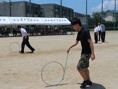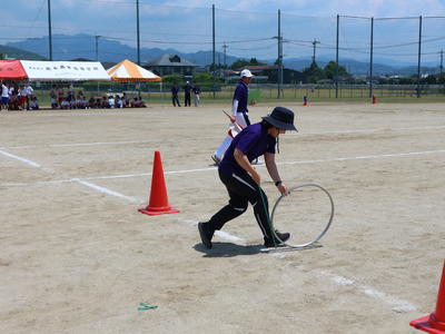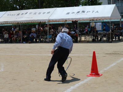 プログラムNo.11 来賓競技 恒例のリム回しです。若い先生は、初めの経験だったのではないでしょうか。 カーブもすいすい。お見事! (つづく) |