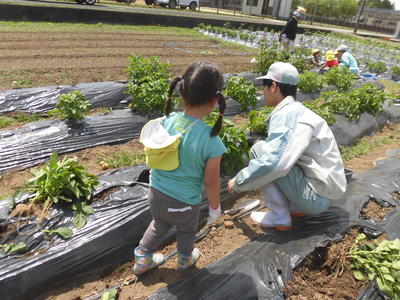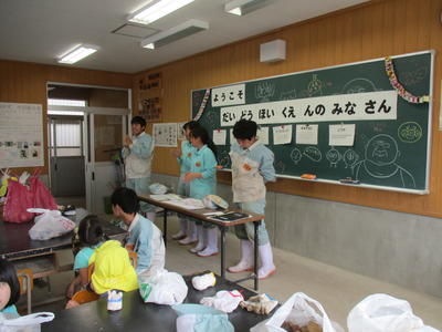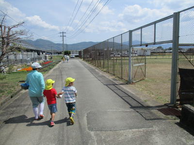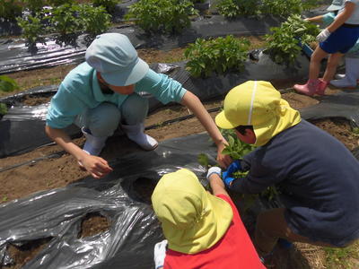 生活科学科では、大道保育園の園児のみなさんと交流学習を行いました。今回は、「ジャガイモ収穫体験!」 黒板には、園児さんたちに喜んでもらえるようたくさんの絵を描き、紙しばいも作って説明します。わかってもらえたかな。 畑に移動、「お姉ちゃんの学校、広いね」 ジャガイモ、あるかなぁ。 ジャガイモの花が、咲いています。 どれがいいかなぁ。 二人で力を合わせて、よっこいしょ。 色々なジャガイモたちが、収穫できました。 「今日のジャガイモ、どうやって食べる?」「カレーライス!」 最後に指遊びして、お別れです。 楽しい時間をありがとうございました。 お兄さんお姉さん、もっとおしゃべりが上手になるよう頑張りますので、また、来て下さいね。