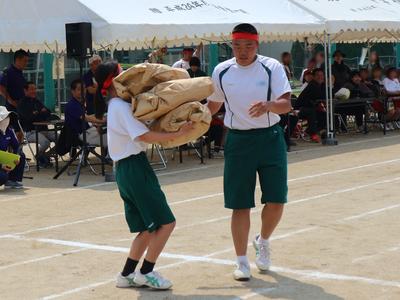 プログラムNo.4 100m走 鹿本農高のスピードスターを決めます。 気持ちに足がついていかないのか、転倒者も続出しました。けがしませんでしたか? 放送係も頑張ってます。 プログラムNo.5 俵さし 女子は12kgの俵を持ち上げます。 優勝は、なんと1年生でした。 男子の俵は30kgです。 3年生がぶっちぎりの優勝。音楽に合わせて踊る余裕さえありました。 (つづく) |