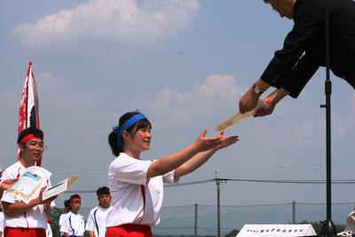 プログラムNo.16 技巧リレー リレーするたびにバトン代わりの俵が増えていきます。アンカーは副団長です。 俵が崩れると大きなタイムロスになります。 優勝は青団でした。 プログラムNo.17 団対抗リレー 各団の精鋭によるガチンコスピードレースです。 アンカーの団長だけは200m走ります。 青団、余裕のローリングゴール! これで競技は終了。閉会式が始まります。 (つづく) |