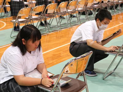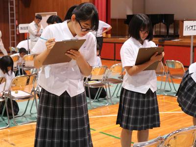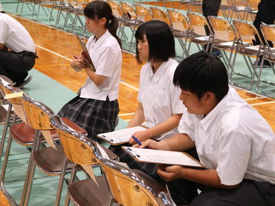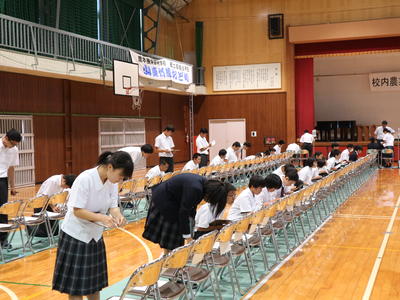 準備が終わり、ショートバージョンの予行を行いました。 開会式 選手宣誓 ラジオ体操 学科行進 生活科学科 100m走 俵さし 重さを確認しました。 技巧リレー 放送係は、実際に原稿を読んでみます。 団結競技 3年生が1年生にアドバイスを送る姿もありました。 フォークダンス このほかにも、部活動紹介や背渡りなど、多くの競技について入場から退場までの動きを確認しました。 閉会式 表彰 今日は炎天下での一日となりました。生徒たちの疲れも考えて、少し早めに終了しました。 さあ、いよいよ明日が本番です。天気の心配はなさそうです。元気あふれる、楽しい一日にしましょう! |