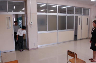 模擬面接のあと、講師の先生から講評をしていただき、最後に、入退室の練習をしています。丁寧なお辞儀、元気な「失礼します。」に、褒めてもらいました。