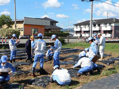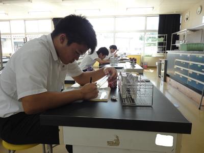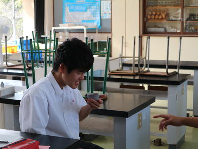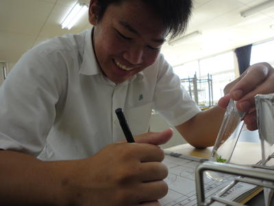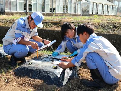 先週、1年生各科の「農業と環境」の様子を紹介しましたが、食品工業科は先進地視察研修で不在でした。そこで、今日改めて覗きに行ってきました。 1年生の共通作物であるダイコンの観察をしていました。 |