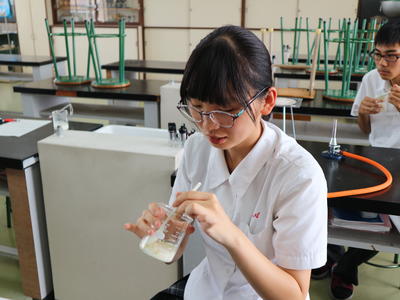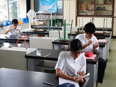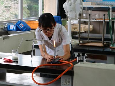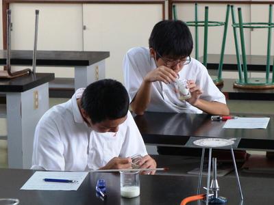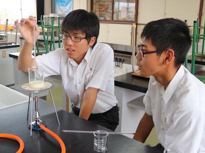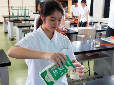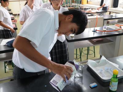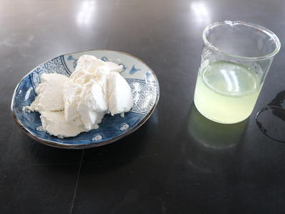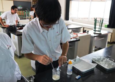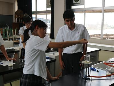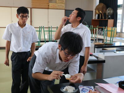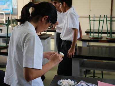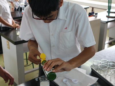 調理実習ではありませんよ。タンパク質が金属イオンや酸によって変性することを確認する実験です。 <豆腐作り> 豆乳を ガスバーナーで 温め にがりを加えてしばらく置くと 固まります。豆腐のできあがりです。 豆乳中のタンパク質がにがりの成分(塩化マグネシウム)の影響で変性して固まったものが豆腐なんです。 <カッテージチーズ作り> 牛乳を 温め レモン汁を加えると 白い沈殿と黄色い液体に分離していきます。 これをキッチンタオルを使って濾してやると カッテージチーズのできあがりです。 牛乳に含まれるタンパク質がレモン汁に含まれる酸によって変性して沈殿し、カッテージチーズができました。 <試食> せっかく作ったんですから、食べてみました。(これがメインだったりして笑) ※今回使ったビーカーなどの器具はこの実験専用なので、安全性はご心配なく。 豆腐はそのままビーカーからすくって食べました。 ダイズの味が濃くて、とてもおいしかったです。 (みんながビーカーから豆腐をすくって食べている光景はとてもシュールで、前から見ていてとてもおもしろかったです笑) カッテージチーズはクラッカーに塗って食べました。 レモン汁を加えているため酸味が強く、「レアチーズケーキみたい」という声が上がりました。 もったいないので、分離した液体も味見しました。 味は...スポーツドリンクと言えなくもないような... とりあえず身体には良さそうです。 <生徒の感想より> 〇実際に豆腐やチーズの原料を合わせて、液体が固体に変わる瞬間を見る貴重な体験ができたので、よかったです。 〇変性は温度だけでなく、ある物質が加えられることでも起こることを知った。 〇にがりやレモン汁を入れただけで、あんなにもすぐに変化が出るのだと驚いた。 〇豆腐はおもったよりもおいしくできた。カッテージチーズは、レモン汁の味が強いがチーズ嫌いでも食べられるおいしさだった。 〇豆腐は少しにがりが苦かったけど、そのままでもおいしかったです。しょうゆを入れると、さらにおいしかったです。チーズはそのままだと少し酸味がありました。クラッカーや塩を入れるとおいしかったです。 |