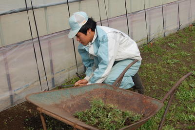 ハウス周辺の草取り。一輪車の中の草の量に注目です。