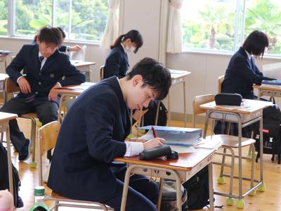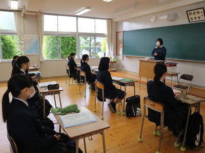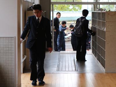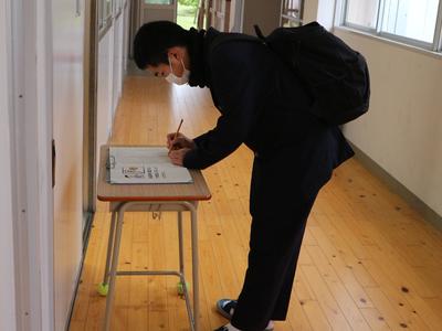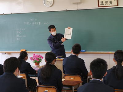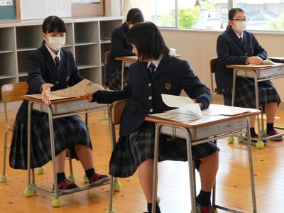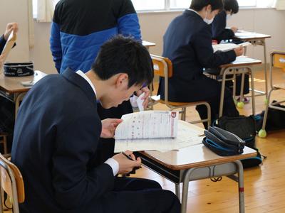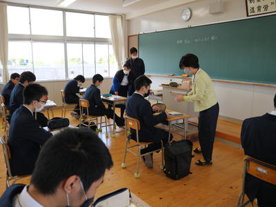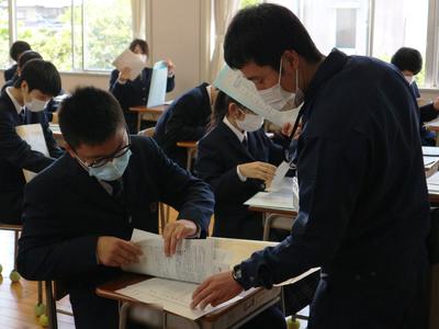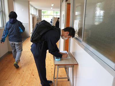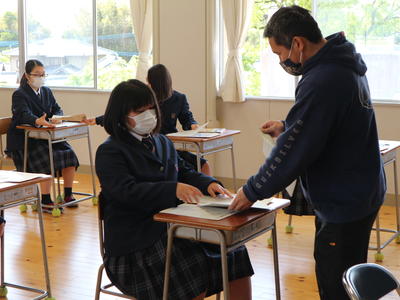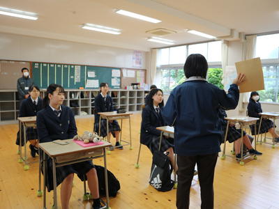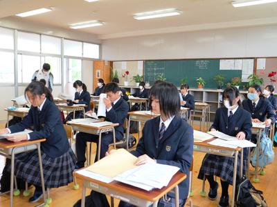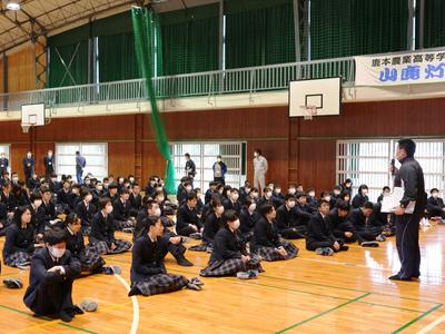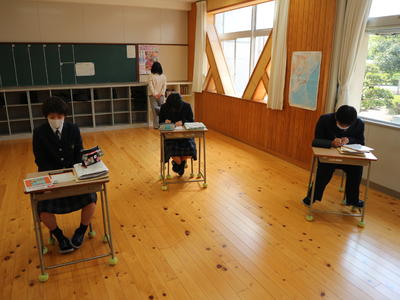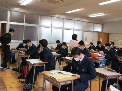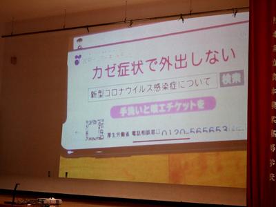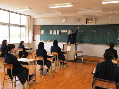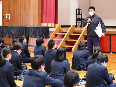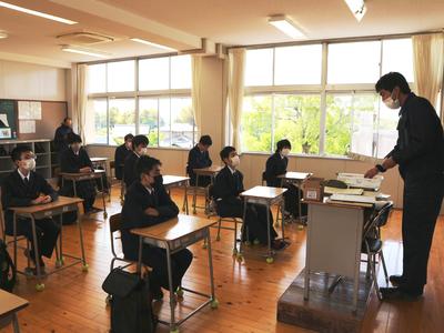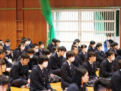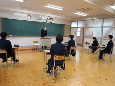 今日は午前中の4限授業とし、5限目に全校集会を開いて休校中の生活についての連絡と注意を行いました。寒い中でしたが扉は開け放ち、生徒間の距離も広めに取りました。