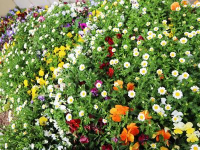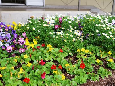 バイオ管理棟横の花壇がとてもきれいなので、映像だけですが、ちょっとおすそ分け。 それにしても、豪華です。いったい何種類・何個の苗が植えてあるのでしょう?農業高校ならではですね。 |