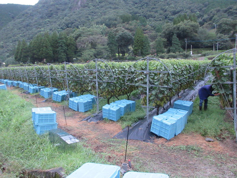 コンテナいっぱい収穫できました。コンテナは熊本ワインの工場に運ばれます。