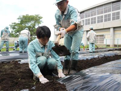 食品工業科の生徒は屋内で加工食品の製造をしているイメージが強いと思いますが、こうやって屋外での農作業も行っているんですよ。