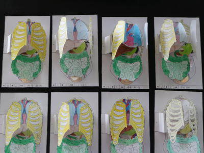 2年生の生物基礎では、私たちのさまざまな臓器(心臓・腎臓・肝臓など)の学習が始まりました。そこで、体のどの辺りにどんな臓器があるのかをイメージできるように、人体模型のペーパークラフトを作成しました。