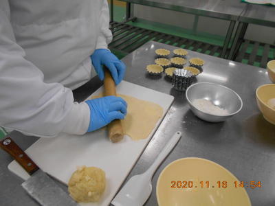 型にパイ生地を張る作業と、パウンド生地を作る作業を2人1組で行いました。