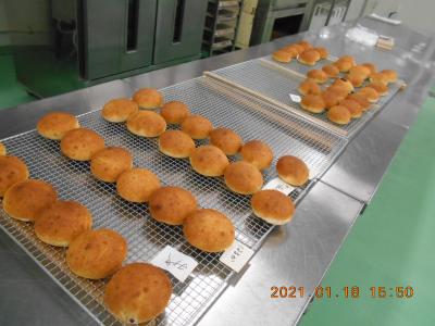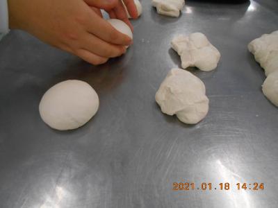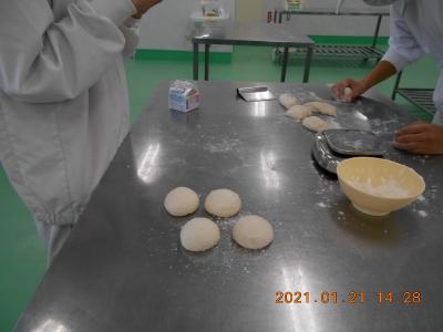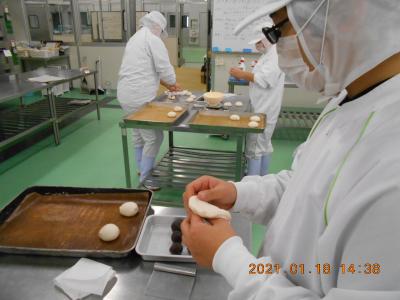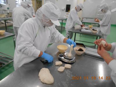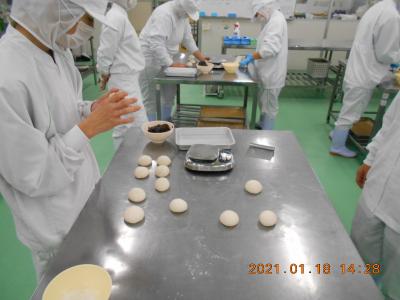 1月18日午後の食品製造で、米粉あんパンを作りました。小麦粉よりも時間が短くすみますが、生地作りや製品のひび割れなど成形も難しいパンです。