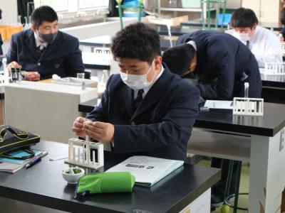1年園芸技術科と生活デザイン科の「科学と人間生活」の授業で、ペーパークロマトグラフィー法による光合成色素の分離実験を行いました。
