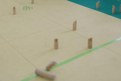 1~12の数字が書いてあるピン(スキットル)に向かって、棒(モルック)を投げます。スキットルが1本だけ倒れた場合は書いてある数字が、2本以上倒れた場合は倒れた本数が得点となります。今回は各チーム4人が交互に2回ずつ投げ、合計60点を目指しました。