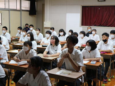 進路指導部 3年生の夏休み以降の進路決定に向けた取り組みが、1・2年生に紹介されました。