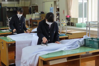 別室では家庭クラブの役員が、テーブルクロスにアイロンをかけたり