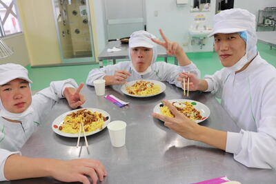 美味しそうなトマトミートソースパスタが出来上がりました。最後はみんなで試食しました。
