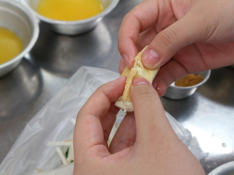 実習では、できるだけ器具を使わず、食材を手でちぎったり、ジュースを味つけに利用したりしました。