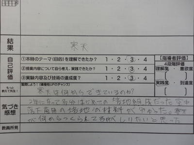 毎回の授業で自己評価を行います。また、その時に気づいたことなどを記入し、次の学習に活かしていきます。上記の写真は記入例です。学期の終わりには、毎回の授業の振り返りを行います。詳しくは、今後、報告します(*^_^*)