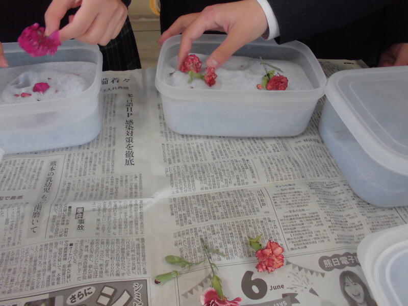 自分たちで栽培したカーネーション。シリカゲルでドライフラワーにして、材料として使います。