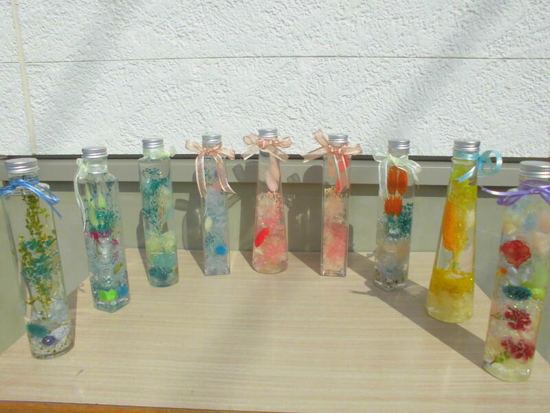 まずはビン選びからです。四角形・円柱形・円すい形・ハート形などがあります。