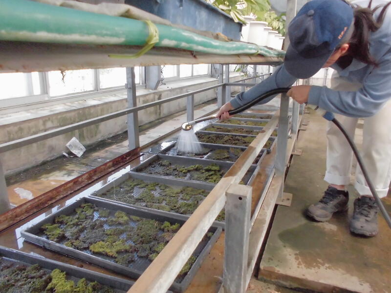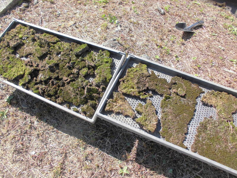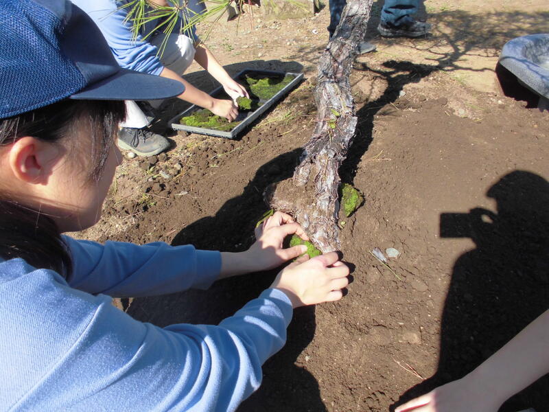 培養して緑が濃くなったコケを松の根元に張りつけました。