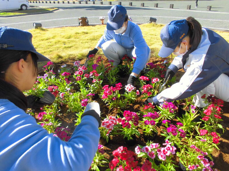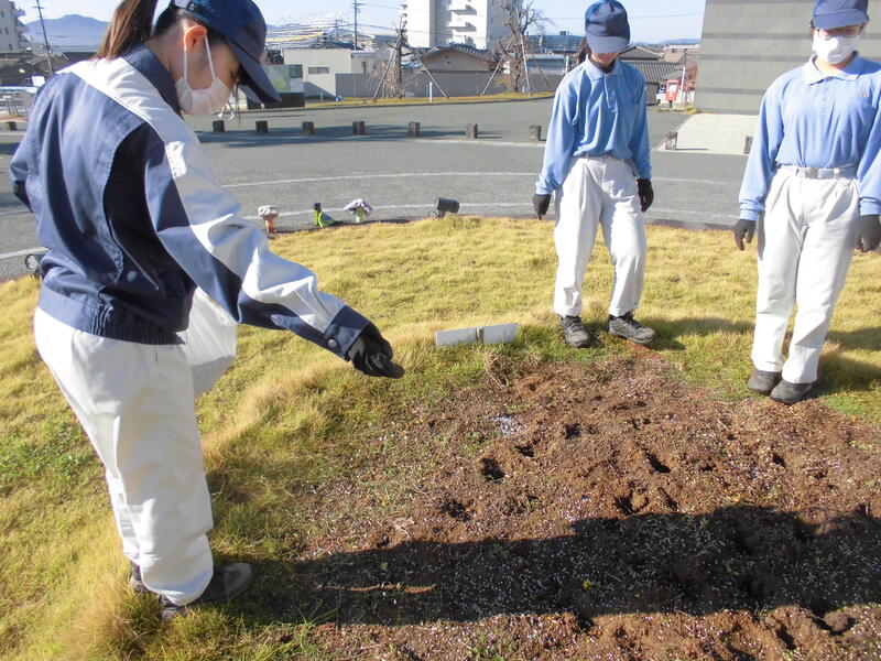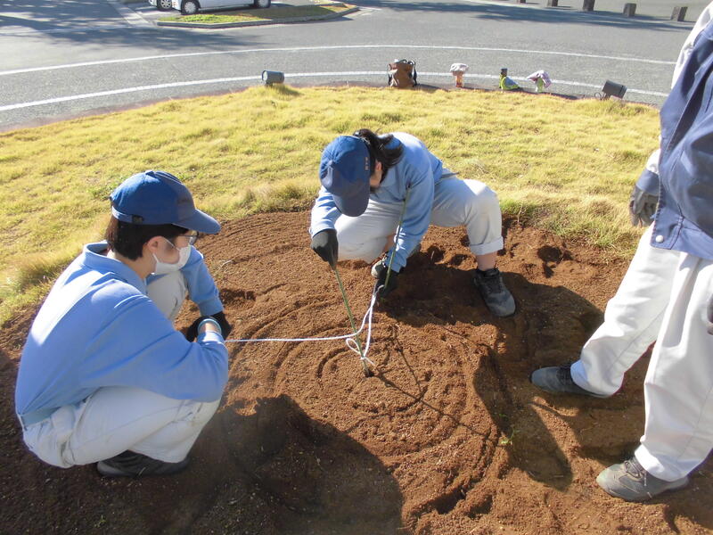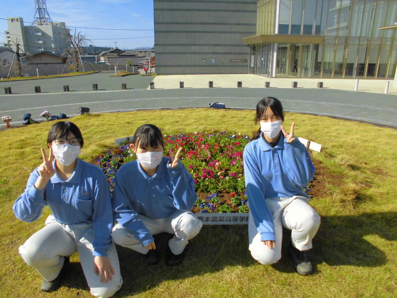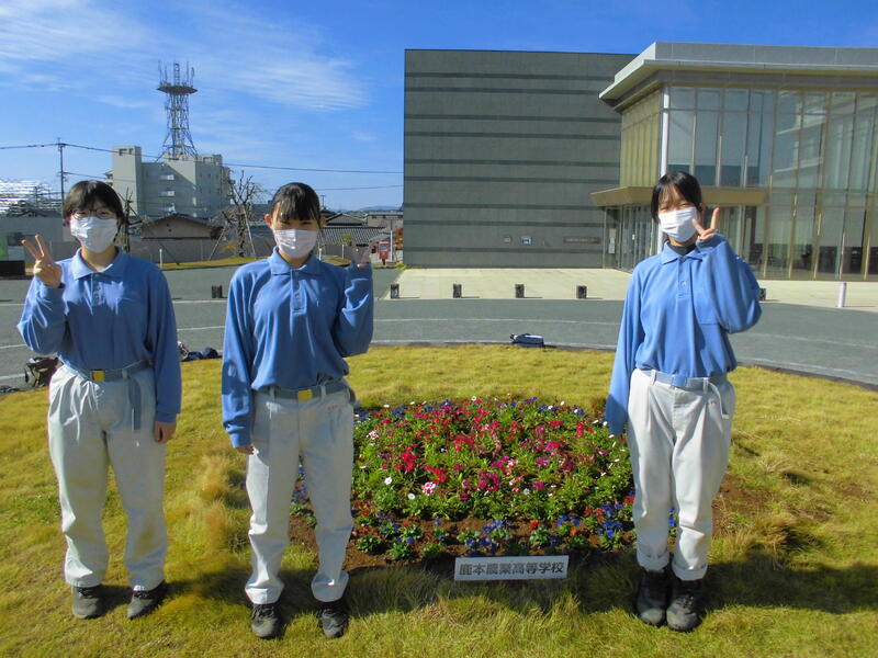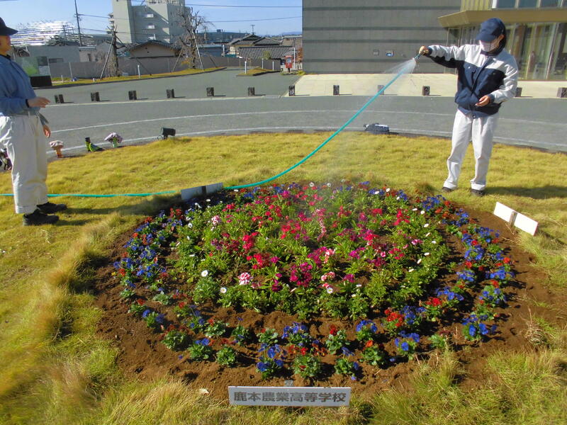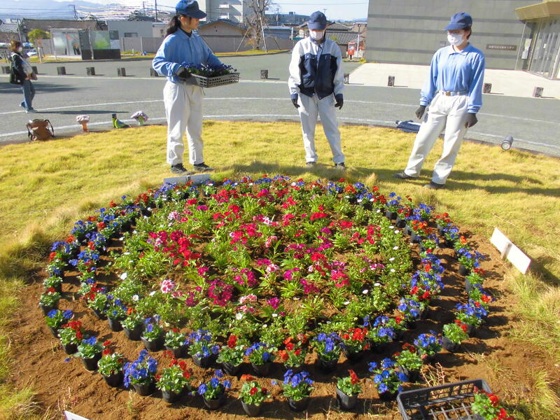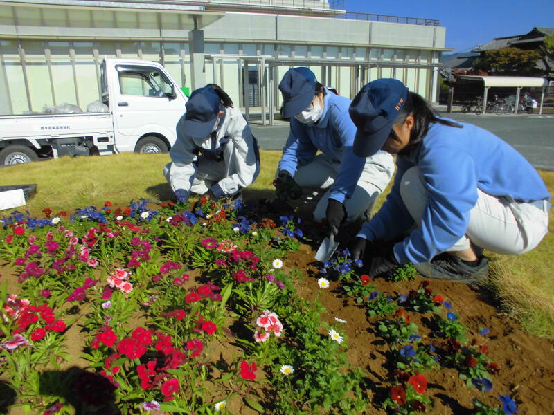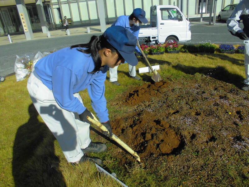生活デザイン科の3年生(地域創造コース)が、山鹿市役所のロータリー花壇の植え替えを行いました