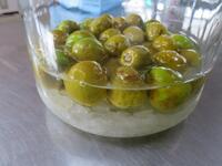 調理室へ持ち帰り、きれいに洗ってヘタを処理し、氷砂糖と酢で漬け込みます。