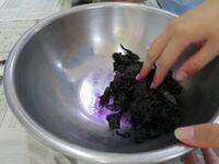 6月26日 白梅酢が上がったので、先日揉んでおいたシソをほぐし入れます。