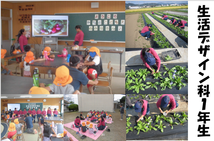 生活デザイン科では1年生から3年生まで近隣の保育園との交流活動を実施しています。前回、種まきをしたダイコンも順調に生育し大きくなってきたので「間引き」と「追肥」を行いました。