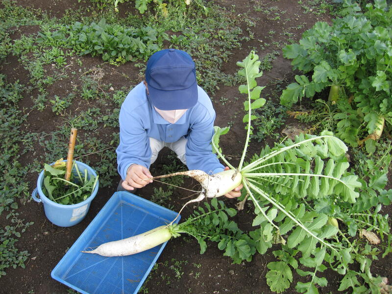 中々抜けないダイコンに悪戦苦闘しながらも生徒たちが手伝いながら収穫しました。