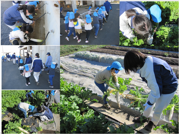 今日は3年生が近所の保育園とダイコン収穫体験を行いました。