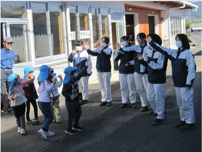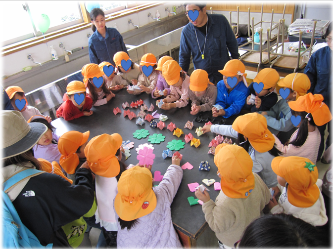 1時間目から4時間目までの交流で、かつ生活デザイン科2,3年生18名 対 山鹿小学校5年生143名という人数差に生徒達も緊張汗・焦る