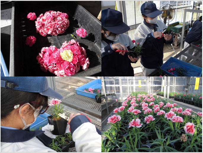 摘心は草姿を整えるために、茎頂部を摘み取り側枝の発生を促し一株当たりの花数を増やすために行っています。