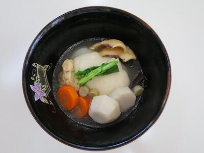 熊本はこんぶのだしで、まあるく切ったゴボウ、ニンジン、ダイコン、イモなどを入れて薄口しょうゆで味を調えるのが一般的です。生徒達もなじみのあるお雑煮に、ほっこりしていました。
