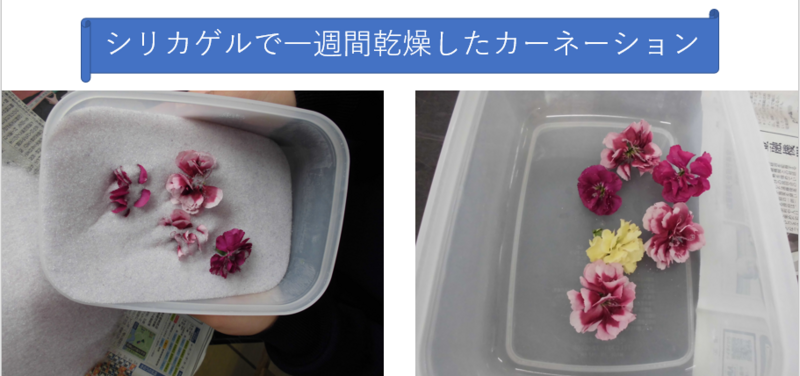 先週のカーネーションの押し花とシリカゲルを使用してのドライフラワーが出来ているか確認しました。