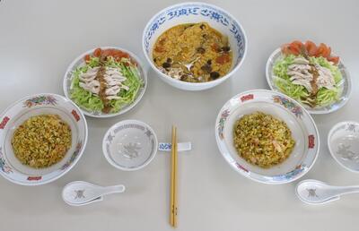 本日の献立は炒飯、酸辣湯、棒棒鶏です。