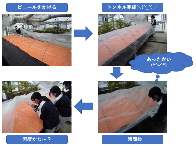 このトンネル内に種まきをしたものを入れれば温かく「発芽の三条件」を満たすことができ、植物を育てることが出来ます。